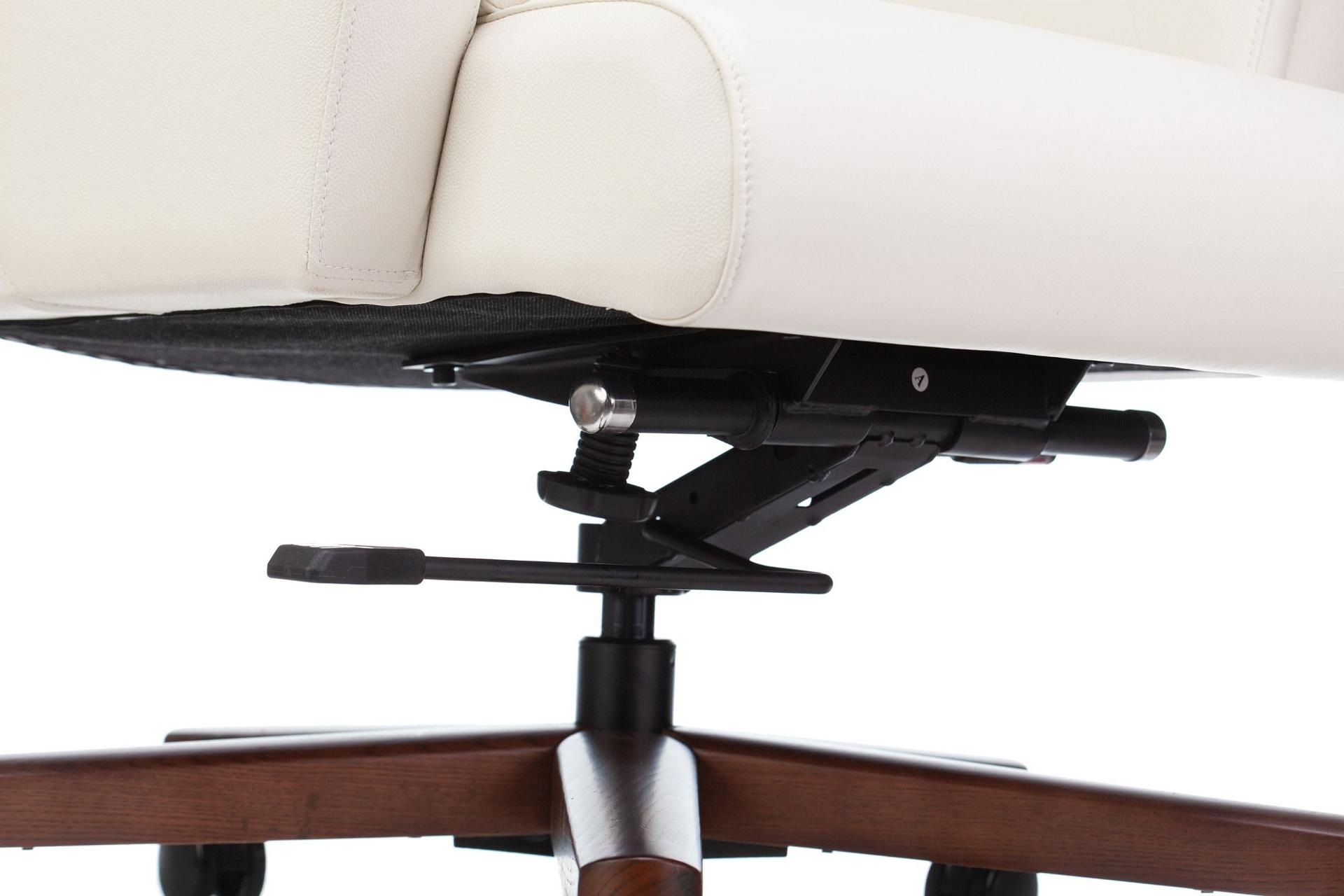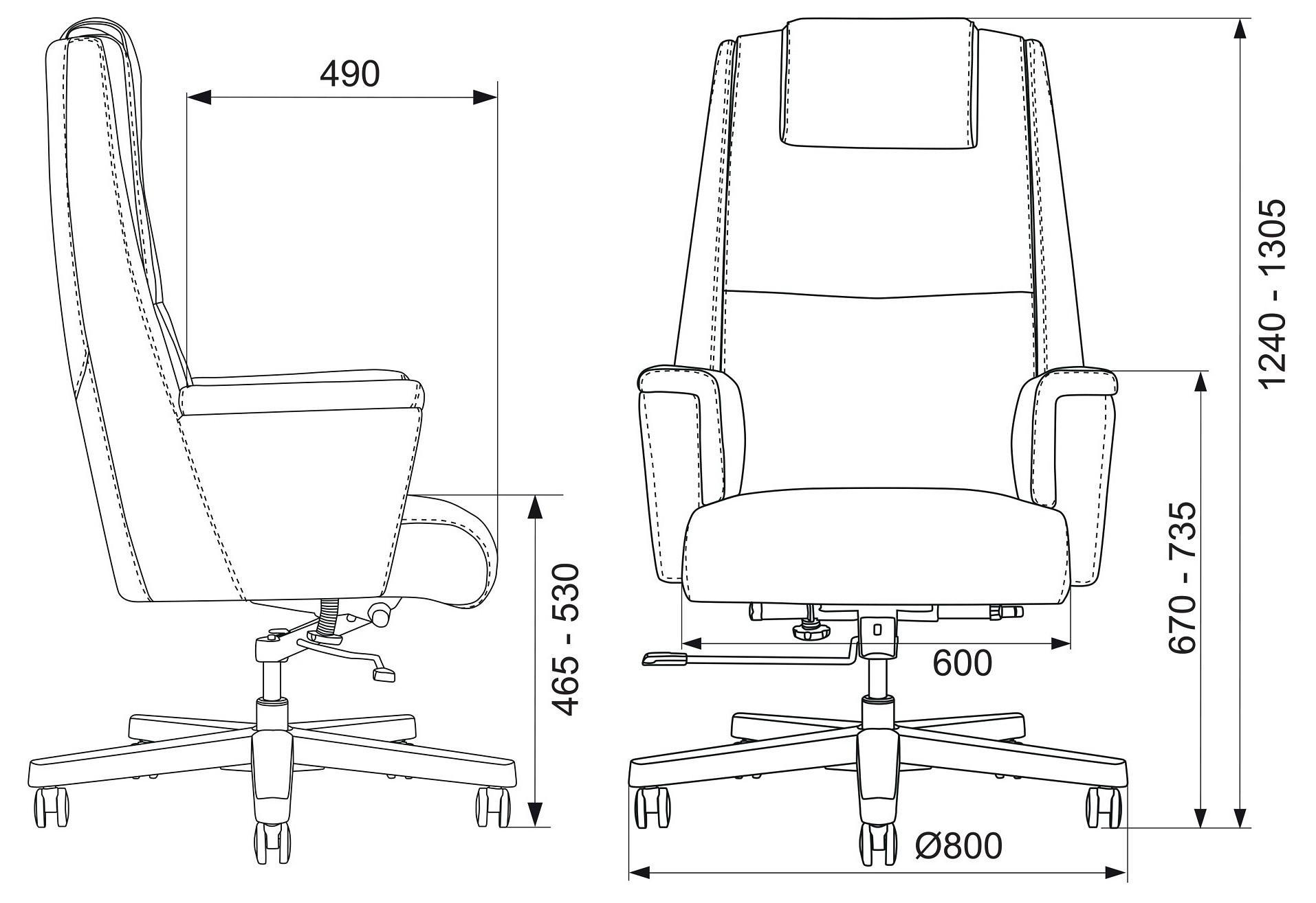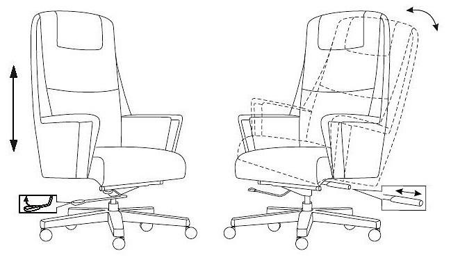 Механизм со смещенной осью качания с возможностью фиксации в вертикальном положении. Регулировка высоты - газлифт. Подлокотники монолитные кожаные. Спинка цельная с сиденьем.