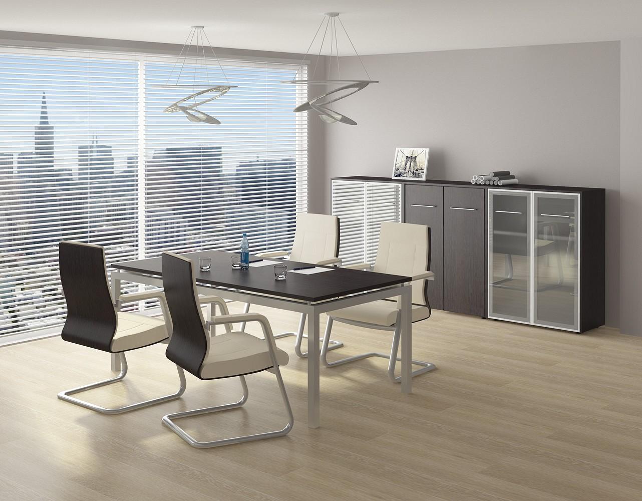 Секции шкафов для документов имеют 1 регулируемую по высоте и 1 фиксированную по высоте полки. Проемы шкафа обеспечивают размещение стандартных папок CORONA высотой 320 мм.